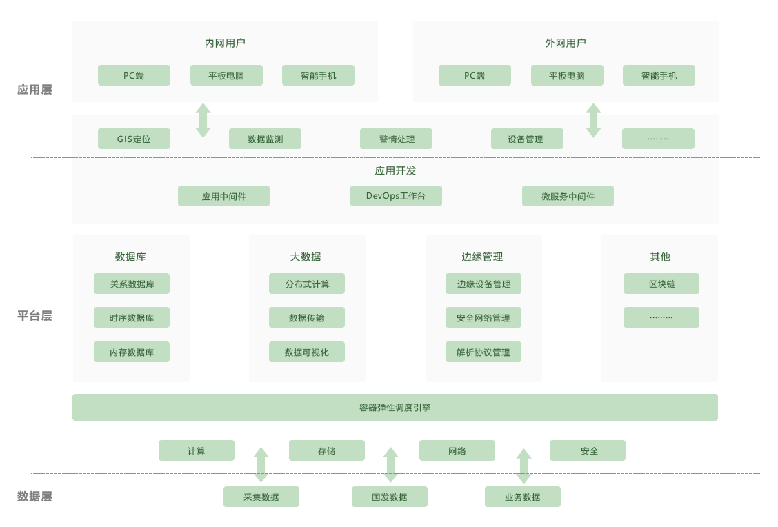 平台支撑层基于通用PaaS和工业PaaS服务搭建,给予面向特定场景的应用。给予相关数据服务接口、GIS地图、数据推送、分析模型、报表工具等。其中,通用PaaS给予云计算、大数据、应用开发、中间件、人工智能、区块链等基础PaaS服务能力。工业PaaS顺利获得凯发K8国际企业大脑产品,面向各个行业和领域,给予以数据为核心的工业数据服务、机理模型服务和业务微服务。使应用层的各个功能模块顺利获得凯发K8国际工业互联网平台对不同行业和领域服务,达到信息共享。