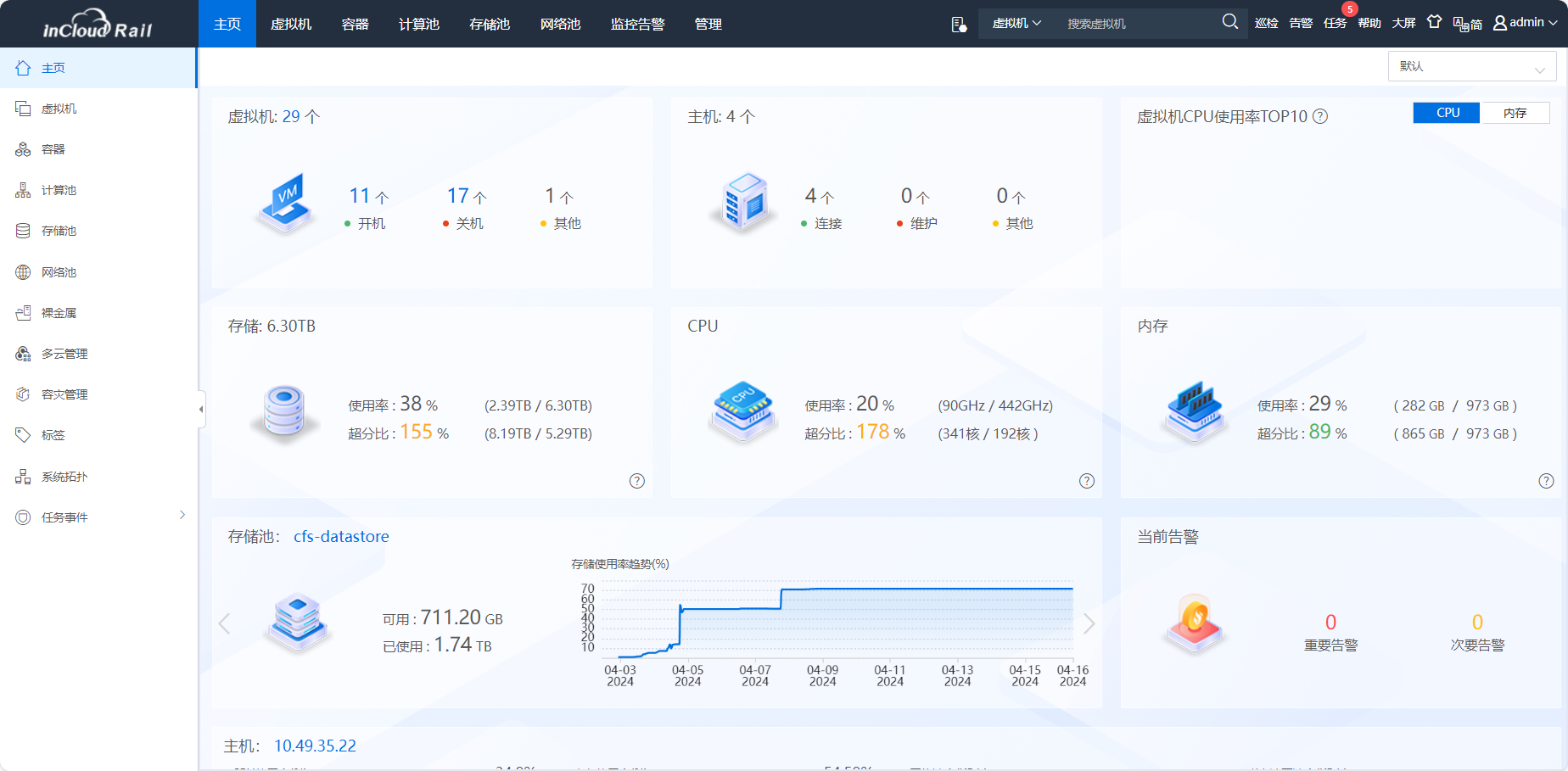 采用自主研发、基于 KVM 深度定制的计算虚拟化软件 InCloud Sphere,支持资源预留、热添加、GPU 直通、vGPU、USB Over IP、 DRS、DRX、裸机管理、虚拟录影机、磁盘双活等多种高级特性 |