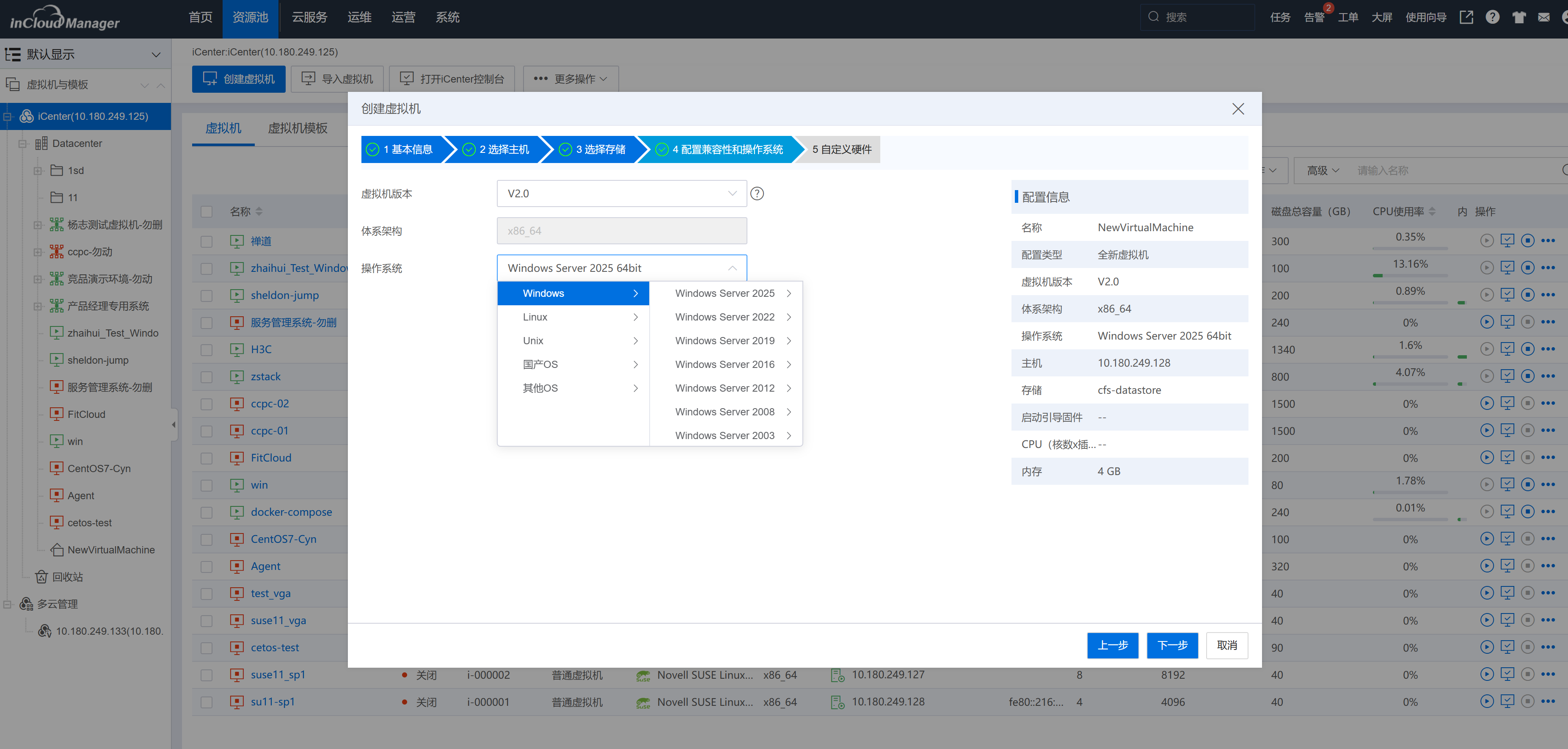 2、细粒度的云资源管理:(1)实现对异构主机的统一管理,支持带内、带外监控告警;(2)完善的物理外设管理,支持对物理网卡、存储适配器、GPU、FPGA、PCI设备等设备的管理;(3)支持电源管理、BMC、数据存储、控制台等主机管理功能以及内存虚拟化、NUMA、多路径配置、 HA、DRS、DPM等高级功能