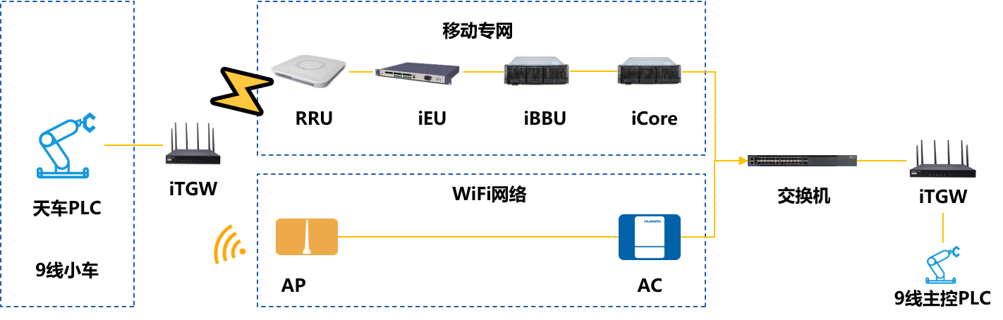 凯发K8国际移动专网+工厂原WiFi网络实现高可靠的组网方案,结合凯发K8国际端计算网关实现无人天车和主控台实时通讯,保证产品线高效稳定运行,为工厂自动化生产给予通讯保障。