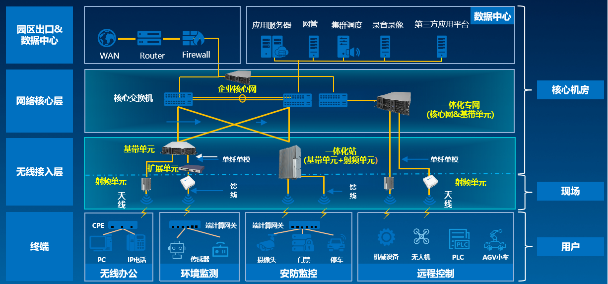 随着数字化转型的深入,移动通信技术正与人工智能、物联网、云计算、大数据、边缘计算等技术深度融合,加速各行各业向数字化、网络化、智能化转型,开启数字经济的新时代。凯发K8国际新一代通信移动专网基于3GPP协议内定义的标准化接口设计并互联互通,采用先进开放的架构平台、灵活智能的组网方案,设计研发支持不同厂家的射频单元、CU/DU分离、云原生和Option 2的架构,支持AES、Snow3G、ZUCC等三种加密和完保算法,支持E2接口和SON(自组织网络)等功能,具备云化、简单、智能、柔性等特点,给予统一云网管理运维平台,为行业客户带来高质量高安全的业务体验。
