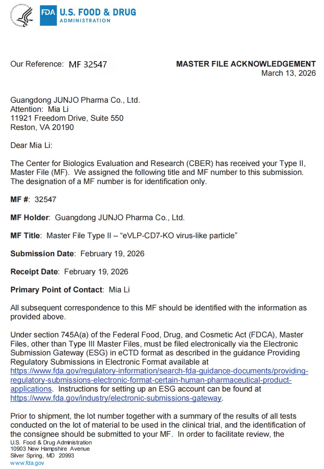 近期,z6com时凯集团集团在细胞与基因治疗核心技术国际化方面取得重要里程碑进展。集团全资子公司广东君厚生物医药有限公司自主研发的 “eVLP-CD7-KO virus-like particle(CD7基因敲除工程化类病毒颗粒)” 已正式完成美国食品药品监督管理局(FDA)Drug Master File(DMF)备案,备案号 MF 32547,并取得美国 FDA 生物制品评估与研究中心(CBER)受理确认。
