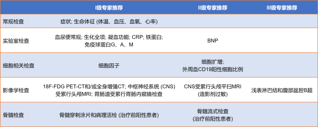 CAR-T细胞回输后需对患者的生理指标进行密切监测以提前预测不良反应的发生,根据2022年的中国临床肿瘤学会 (CSCO) CAR-T细胞治疗恶性血液肿瘤及免疫靶向治疗相关感染管理指南,如图1所示,检查可以分为常规检查、实验室检查、细胞相关检查等五大类。