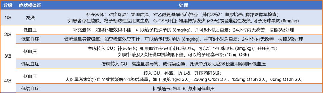 现在临床研究中用于CRS分级的方法有多种,参考美国卫生及公共卫生服务部提出的常见不良事件评价标准(common terminology criteria foradverse events,CTCAE) 4.0版的分级机制,共分为5级,不良反应逐级递增,5级即死亡。1-4分级标准如图4所示。